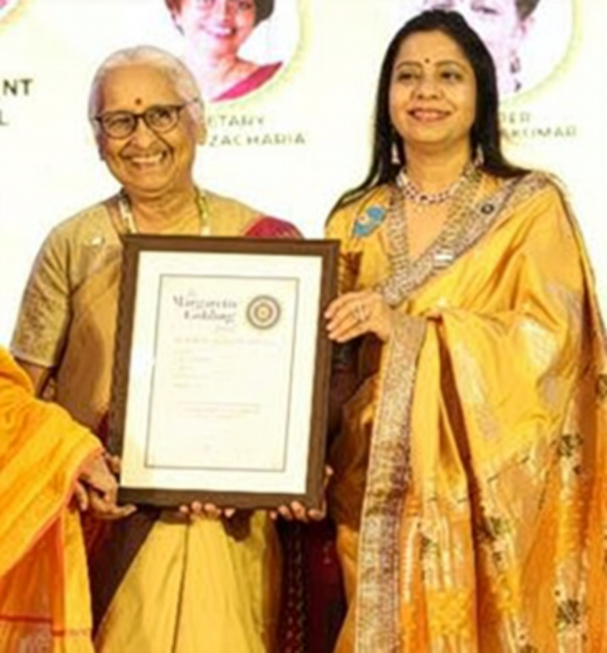 M. Sreekumari received the award for her life-long service in helping vulnerable women and young girls through her remarkable work at the Hindu Mahila Mandiram, a non-profit organisation in Kerala, India. Photo shows M. Sreekumari (left) receiving the Margarette Golding Award certificate from Jyoti Mahipal, the National Representative 2025-2026 of Inner Wheel India, at a ceremony during the Inner Wheel 321 District Conference on 22 February 2026.